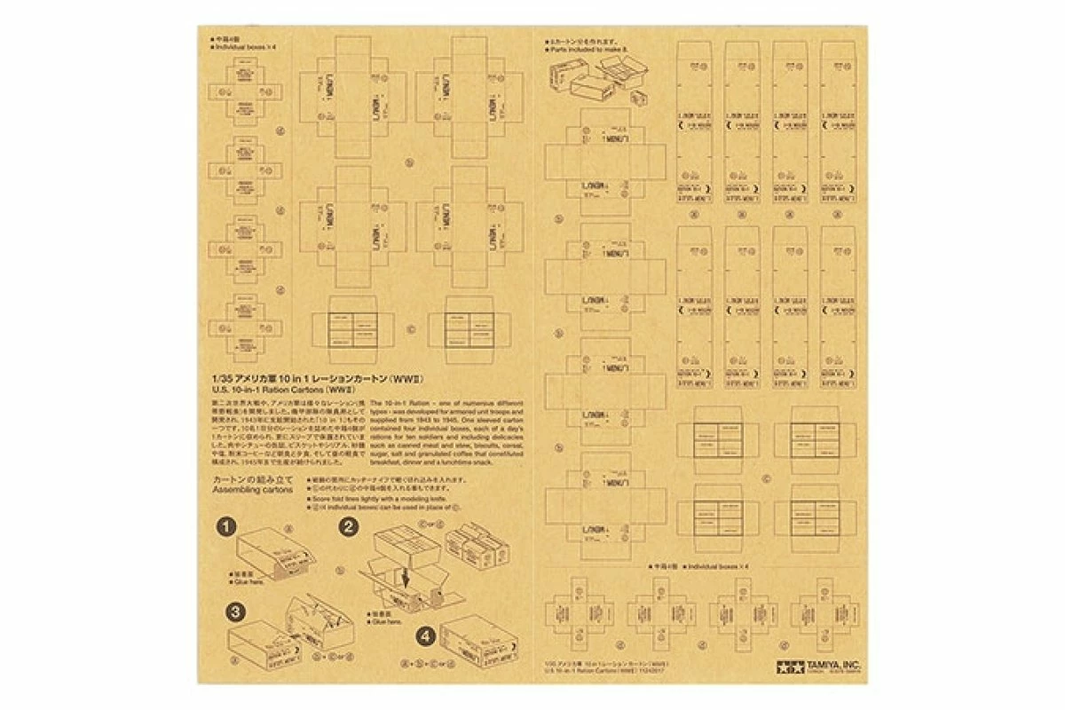 These are detailed depictions of WWII 10-in-1 ration cartons. The 10-in-1 Ration was supplied to U.S. troops from 1943 to 1945. One sleeved carton contained four individual boxes, each contained a day’s rations for ten soldiers and included canned food, biscuits, cereal and more.
