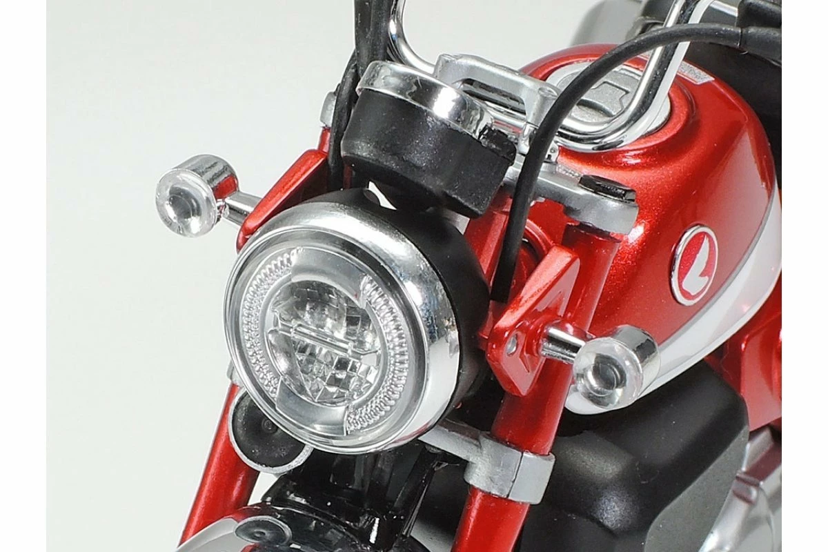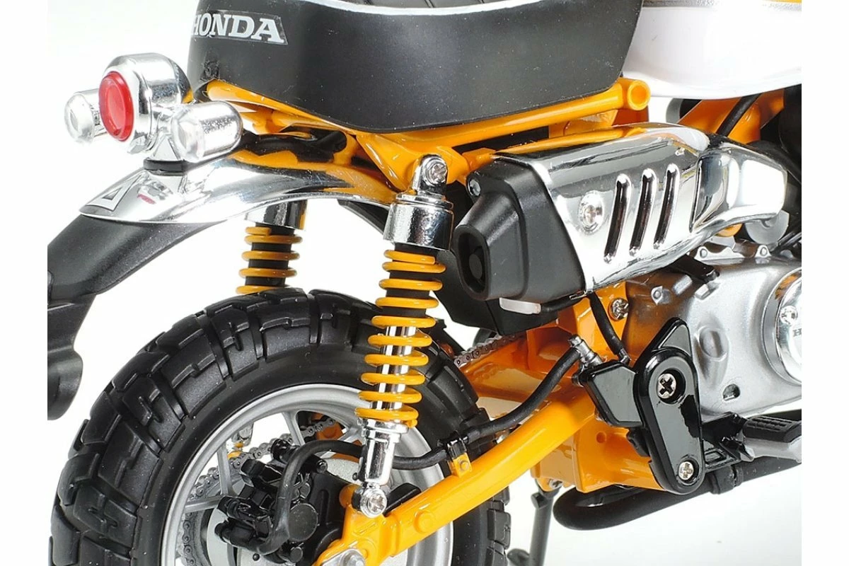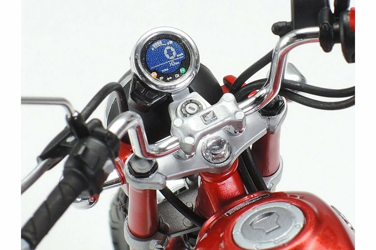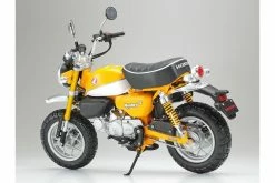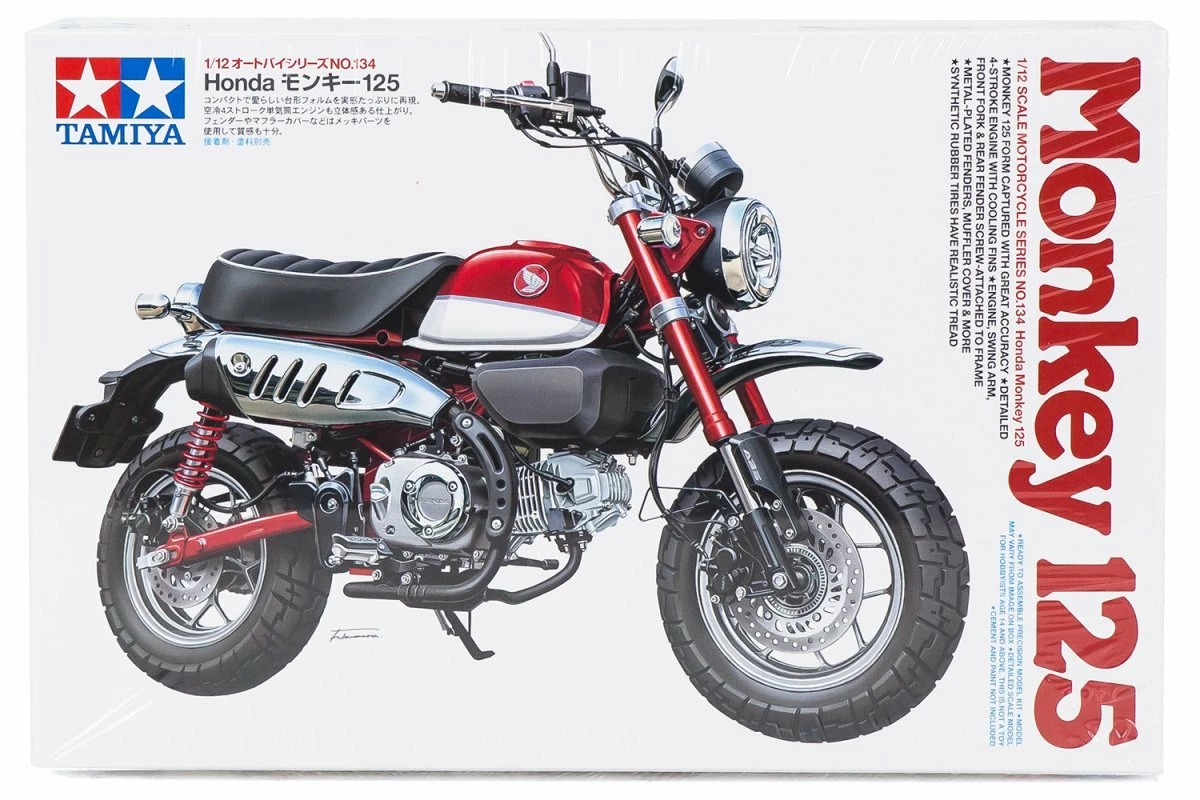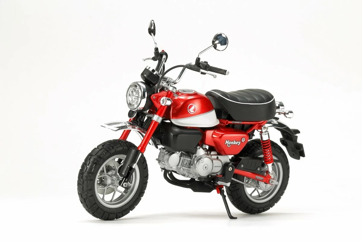 This Tamiya 1/12 model replica recreates the all-new Honda Monkey 125. The Monkey line was first sold in Japan in 1967, and soon gained long-lasting worldwide acclaim with its rather diminutive yet cheerful design. The Monkey 125 features a bigger 124cc engine, yet is packed with the Monkey’s trademark cheeky charm – chunky tires, rounded design motifs for headlight, speedo and more, plus gleaming chromed fenders and muffler cover.Â
