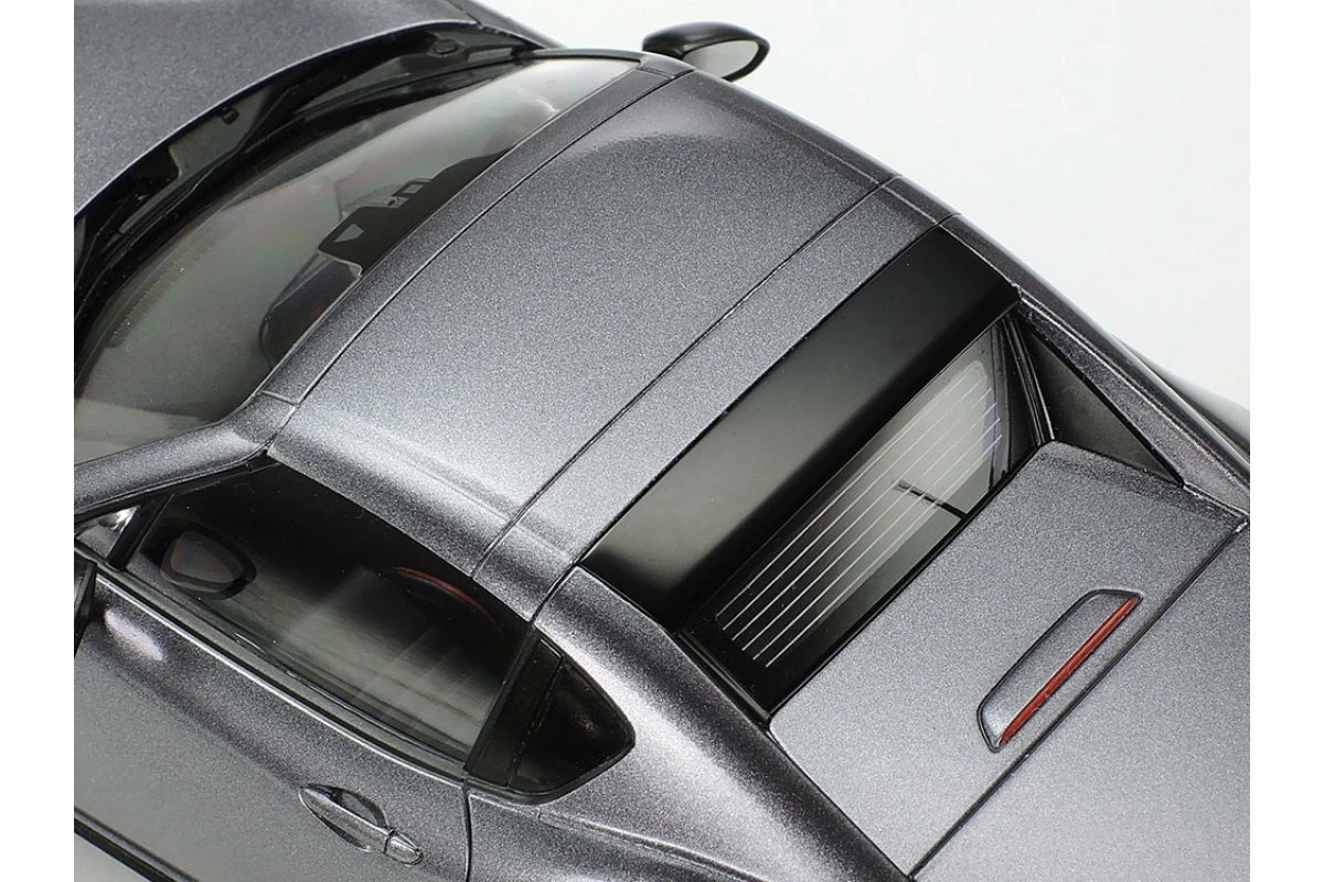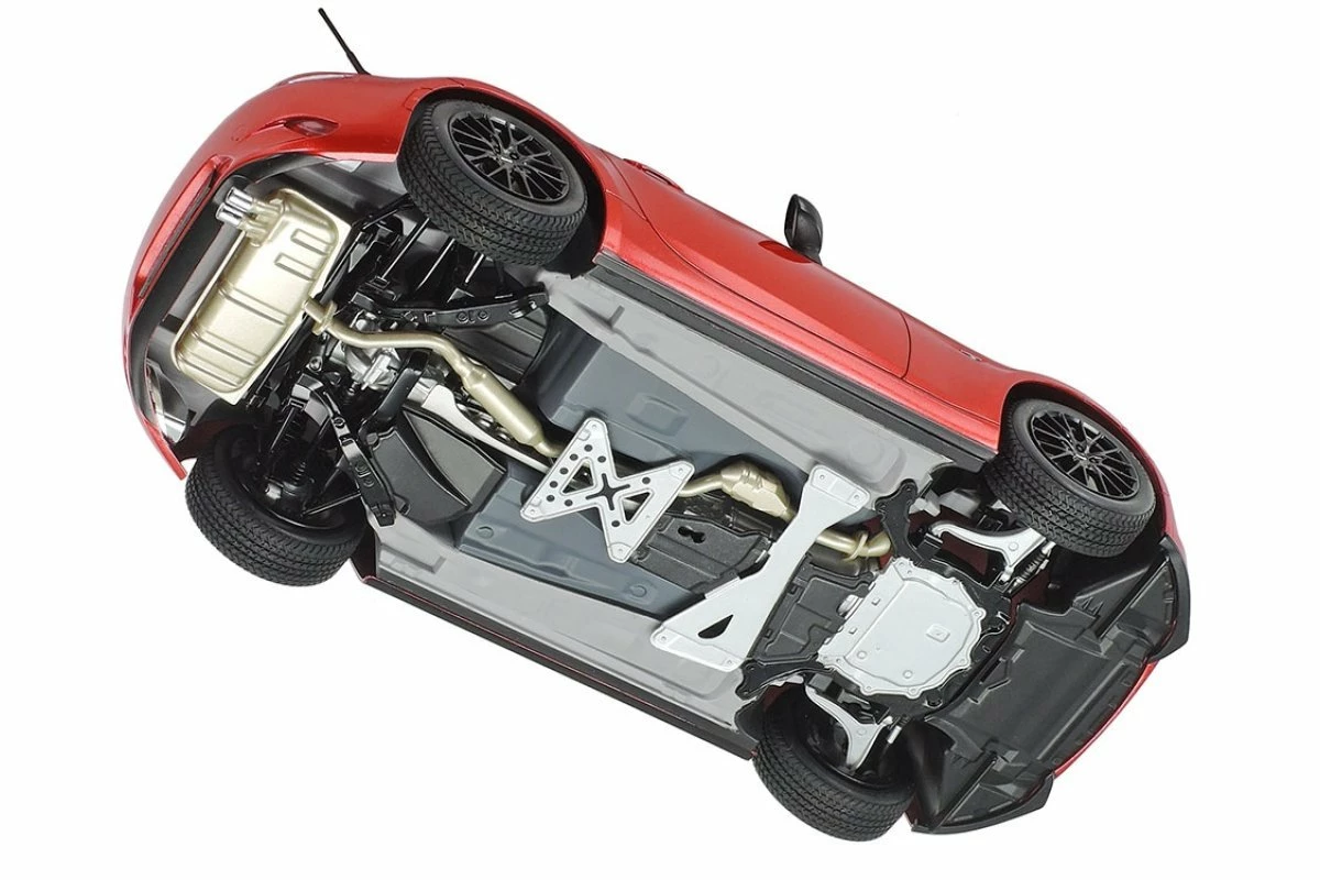 This model assembly kit recreates the fun to drive MX-5 (also known as the Miata MX-5 in the US and Roadster in Japan). Specifically, the kit recreates the RF model that was originally announced by Mazda in 2016: the initials stand for Retractable Fastback, as the car features a sleek fastback hard- top design with innovative retractable roof. In fact, the actual car’s three-piece roof opens and closes in just thirteen seconds, and all at the push of a single button. It also features tweaks to its chassis and suspension to accommodate the heavier top section, while retaining all of Mazda’s vaunted safety features.