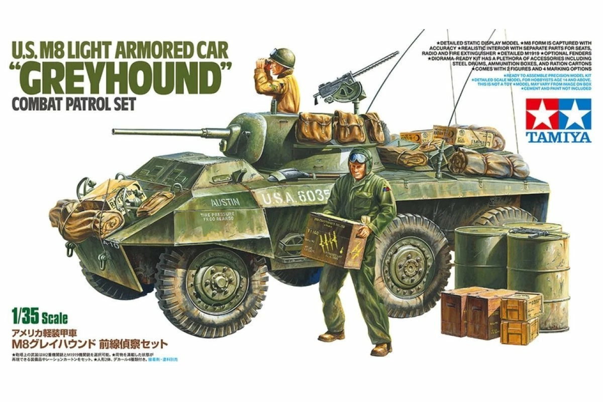 This is a limited-edition model assembly kit which pairs the popular M8 “Greyhound” armored car kit (Item 35228) with existing Tamiya figure and accessories! The kit also includes a bonus sheet for creating new ration cartons. The kit is ideal for anyone creating a mini-diorama straight out of the box.