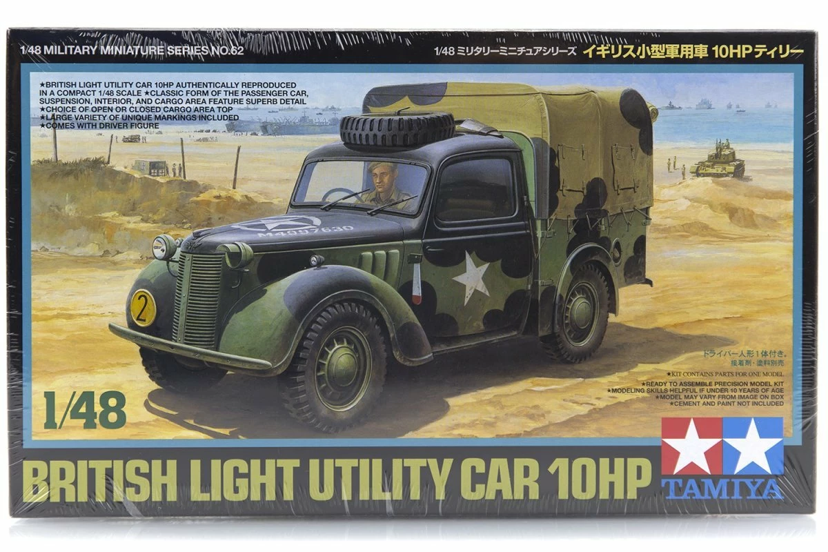 This is a 1/48 plastic assembly kit model of the British Light Utility Car 10HP. ?Length: 84mm. Based on actual research data, the classical form of this vehicle has been richly reproduced. ?The car’s undercarriage, interior, and cargo area are accurately depicted with less parts. ?You can choose to display your model with either an open or closed cargo cover. Adding more enjoyment is the choice of displaying the cargo cover’s rear flap in an open or closed position. ?Further enriching this set are 1944 Northwestern European front British Army, 1944 British Army Polish Corps, and RAF vehicle markings as well as British corps and unit markings. ?Driver figure included.