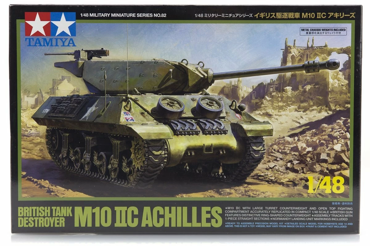 ?This is a 1/48 scale plastic model assembly kit. ?Length: 152mm, width: 64mm. ?The model accurately captures the M10 IIC’s powerful form with ring-shaped counterweight fitted to the long main gun barrel, plus distinctive turret-rear counterweight. ?Intuitive open-top fighting compartment parts design makes for a detailed finish yet hassle-free assembly. ?Separate parts recreate tank-front additional armor plus spare road wheels and tracks. ?Features realistic link-type assembly tracks with one-piece straight sections. ?Included marking scheme recreates Normandy landings unit M10 IIC.