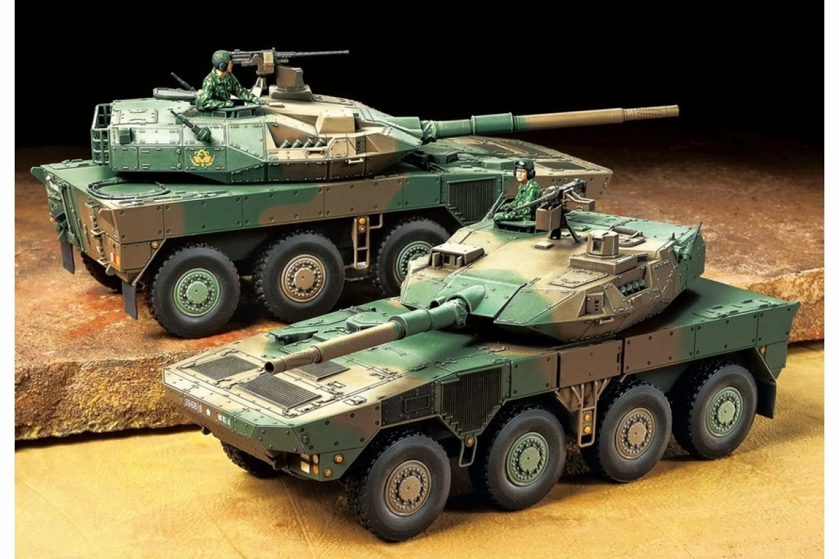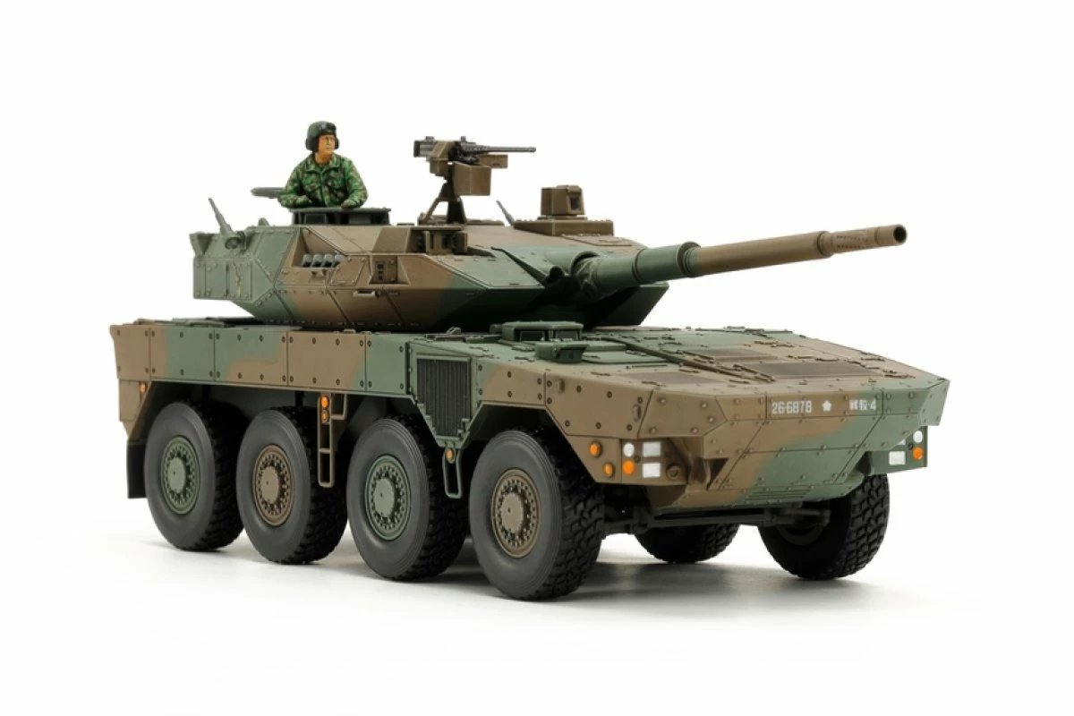 This scale model assembly kit recreates the Japan Ground Self Defense Force (JGSDF) Type 16, which reached units beginning in 2017. An 8-wheel vehicle, the JGSDF classify it as a Maneuver Combat Vehicle (MCV), a highly mobile and well-armed vehicle intended to provide supporting fire and take on enemy armor as a part of rapid response units. Its domestically designed L/52 105mm rifled gun is a low-recoil piece with perforated muzzle brake and a fire control system to enable accurate firing on the move. Rolled steel turret and hull employ modular and spaced armor estimated to be able to survive frontal hits from 20-30mm class guns and portable anti-tank weapons. Thanks to its 570hp engine, the 26-ton Type 16 has a top speed of around 100km/h and significant range; it looks set to provide a major boost to JGSDF units as its rollout continues.Â