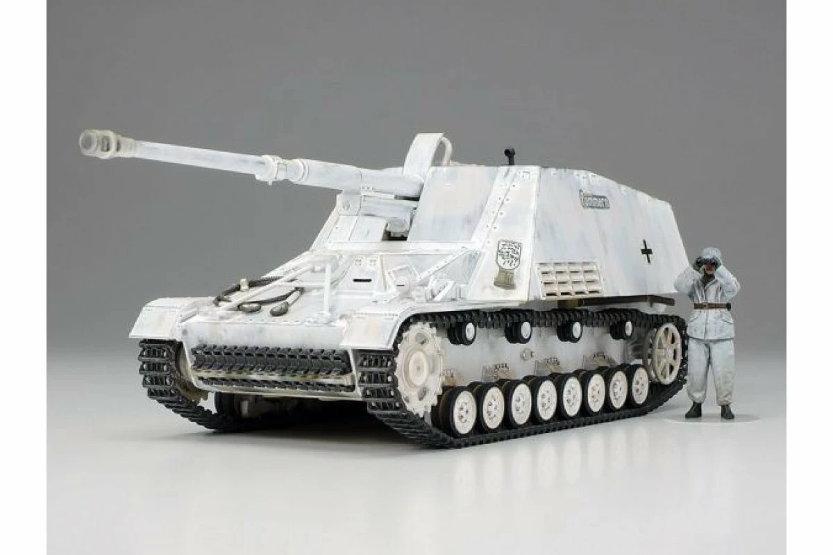 This is a highly detailed model of the WWII German tank destroyer Nashorn. The German Army developed self-propelled anti-tank guns in order to counter the overpowering Russian T-34 and KV tanks, and the Nashorn had particularly overwhelming power among the many anti-tank guns produced. The production started in February 1943, and the Nashorn sported an L/71 8.8cm Pak43/1 gun which was capable of penetrating armour from a long distance. At the Italian Front, the Nashorn knocked out an M4 Sherman at 2.8 kilometres, and its excellent firepower was indispensable to the German forces until the end of WWII.