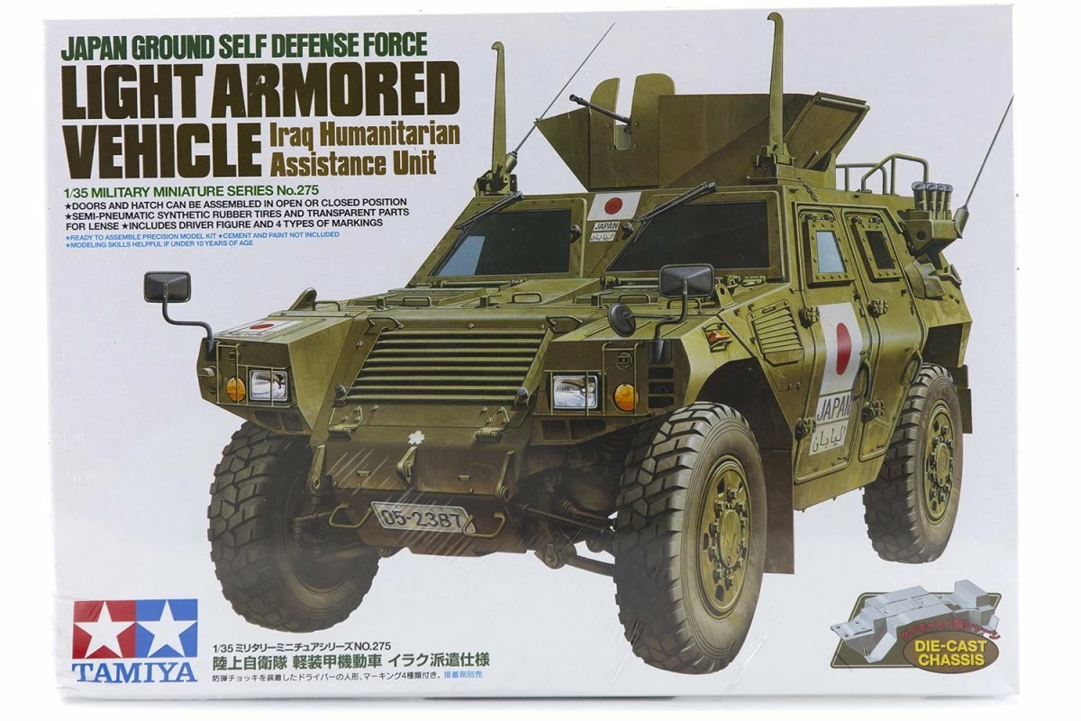This Tamiya 1/35 scale model kit recreates a domestic-specification Japanese Self Defense Force Light Armored Vehicle. A previous release kit (item 35275) depicted an Iraq PKO spec vehicle. The Light Armored Vehicle is an integral part of Japan Ground Self-Defense Force (JGSDF) infantry units, key to the emphasis placed on mobility by recent policy changes. Around 1,900 in total have been provided to the JGSDF and the JASDF air arm.