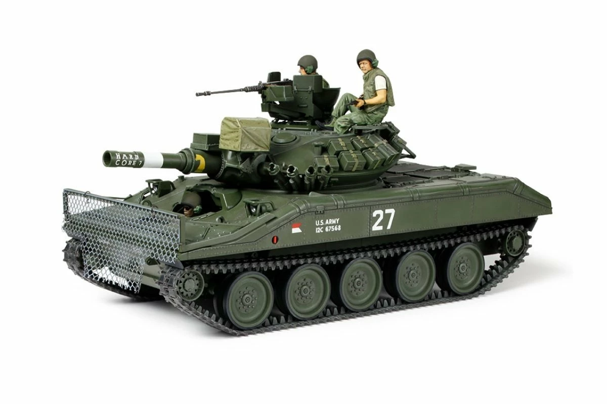 This model kit recreates the M551 Sheridan Armored Reconnaissance/Airborne Assault Vehicle (AR/AAV). The M551 was designed as airdrop capable armor with wading capabilities, a key concept as the U.S. took on the role of global policeman post WWII. With an aluminum hull and rolled steel turret, it weighed just 15 tons, but had impressive firepower in the shape of the M81 152mm gun/launcher, which could fire standard rounds and MGM-51 Shillelagh missiles. The M551 was in service with active units from 1968 to 1996, and saw action in the jungles of Vietnam.Â