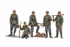 - Contains parts for 5 figures in realistic poses: a non-commissioned officer (NCO) with binoculars, a rifleman with his foot on some rubble, another with cases and one with grenade cases on the ground, plus a machine gunner.