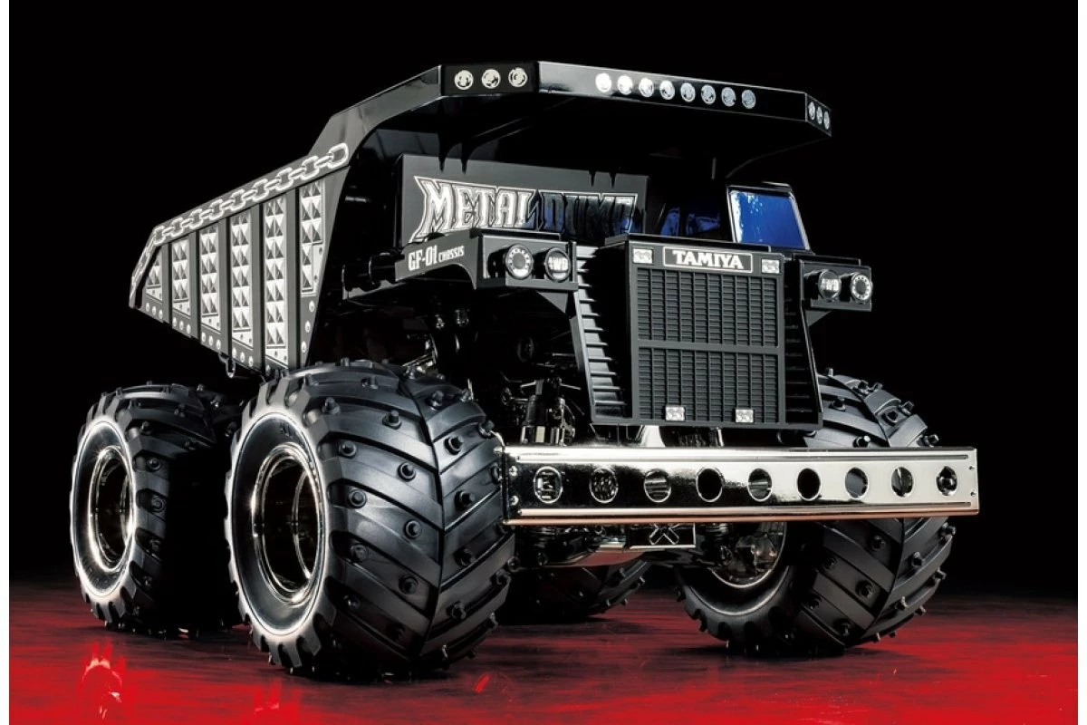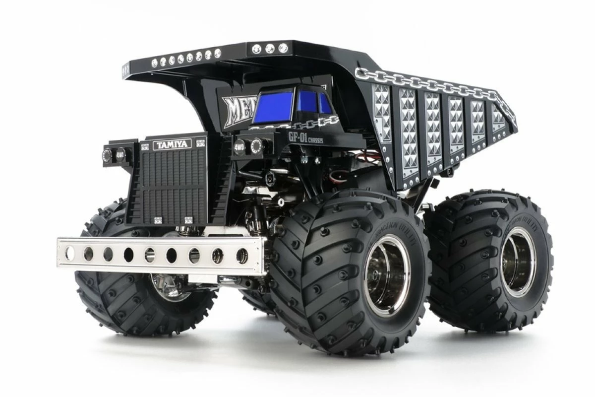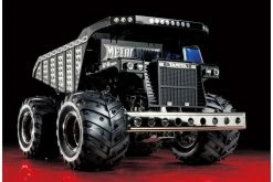 Dump trucks earn their living in some of the toughest workplaces around: large-scale construction sites, mines and quarries to name but a few. This R/C model assembly kit has a unique and exciting color scheme: rather than the yellow typical of such construction vehicles, it is black-based with numerous chrome-plated parts. The cab and rear bed are molded in black, and metallic stickers are provided to depict logos and markings including stud and chain motifs, to give the model some real attitude. Chassis monocoque, front bumper, rear support bar with roller and wheels are all chrome-plated. Spike tires round off the look.