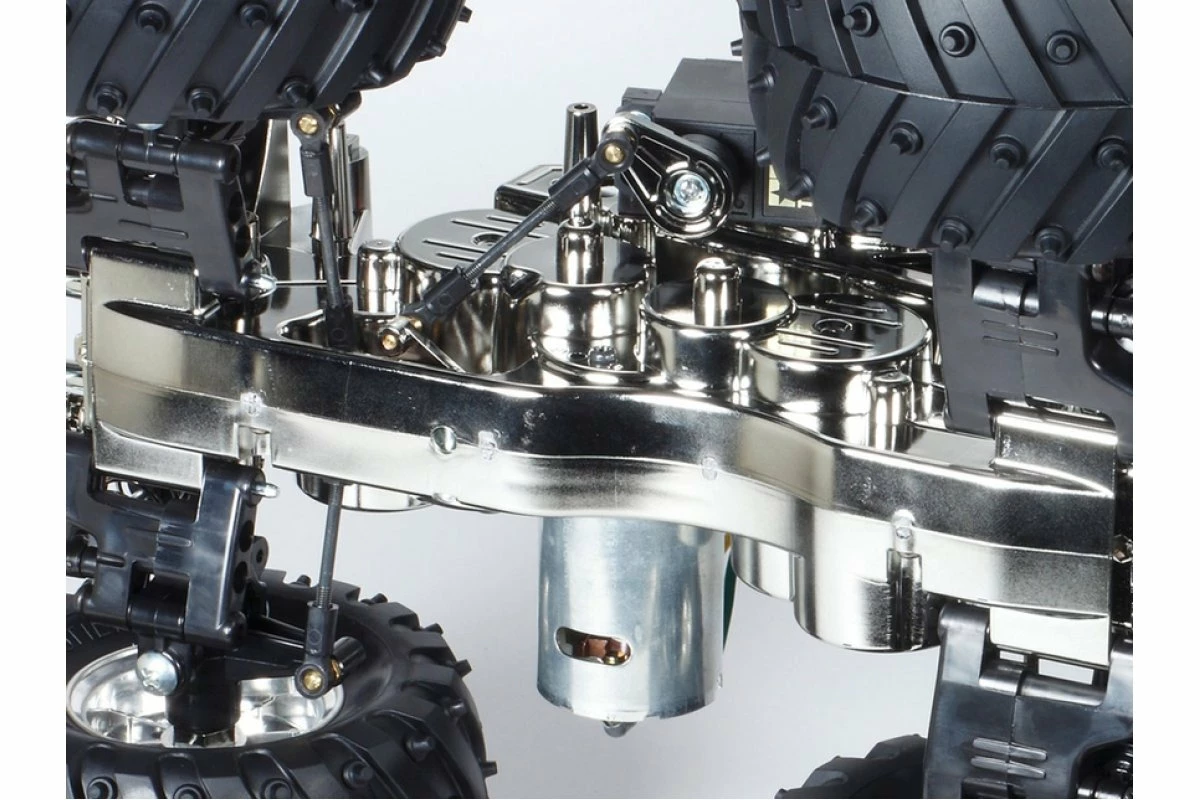 This gear-driven 4WD chassis is based around a lightweight and tough monocoque frame, with power provided by the centrally-positioned motor. It utilizes a ‘square’ setup with similar tread and wheelbase lengths. Sealed gearbox is integrated into the frame and protects from dust and debris, while the built-in front and rear differential gears provide smooth cornering. This is reinforced by 4-wheel double wishbone suspension and friction dampers plus a 2-piece tie rod steering setup with the servo on the left for excellent response. Furthermore, it has chrome-plated wheels to match the chassis, fitted with big 115mm diameter soft compound lug pattern spike tires, plus a rear support bar with roller to prevent the model from flipping.