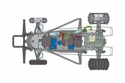The model’s lightweight and durable chassis is based around a bathtub-type frame. It features front swing-axle suspension with friction dampers, while the rear is cushioned by a rolling rigid axle setup and oil dampers for excellent shock absorption. The differential is enclosed in a sealed gearbox to ensure that dust and dirt stay outside, allowing it to continue providing smooth cornering. Three-piece wheels give the car authentic buggy looks, with grooved front tyres and rear spike tyres guaranteeing superb performance on- and off-road.