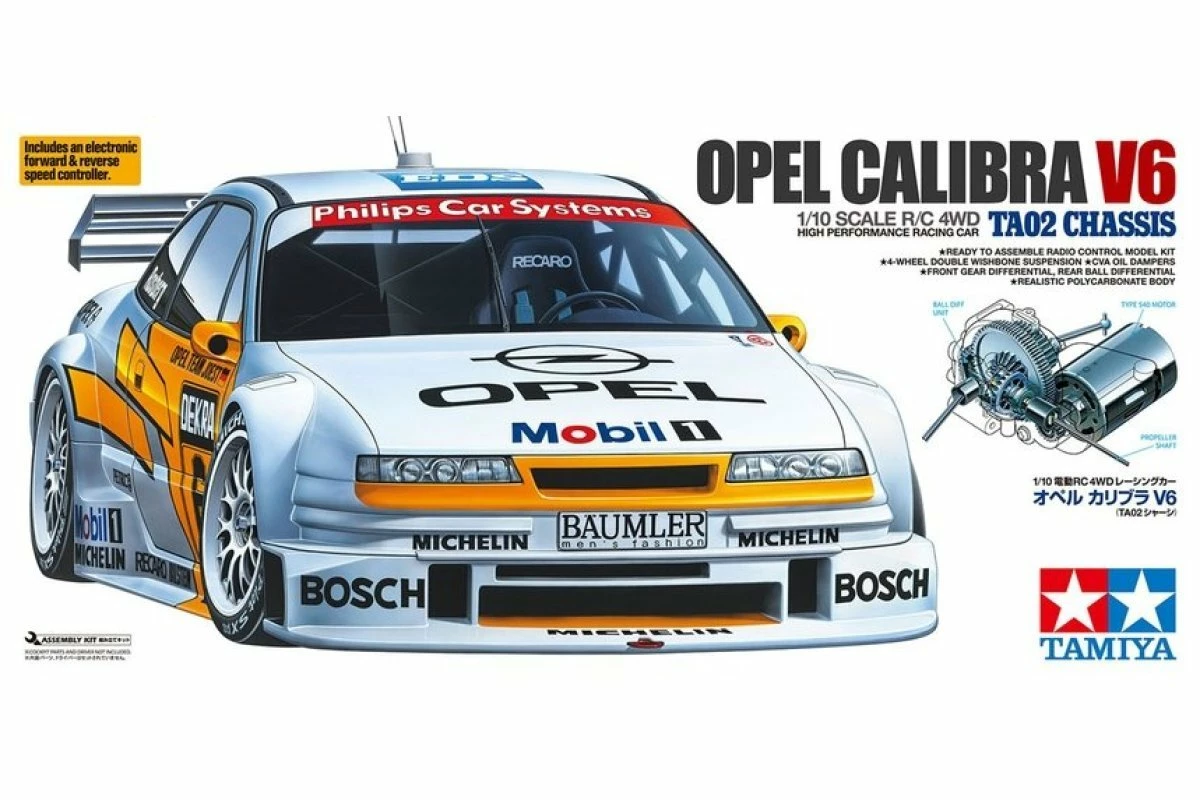 Get some 1990s touring car action with this welcome return for the Opel Calibra V6 to the Tamiya R/C model line-up! The 1994 model’s stylish, bulky 2-door body is recreated in polycarbonate with separately molded side mirrors, wiper arms and rear wing, and two big sticker sheets to decorate it.