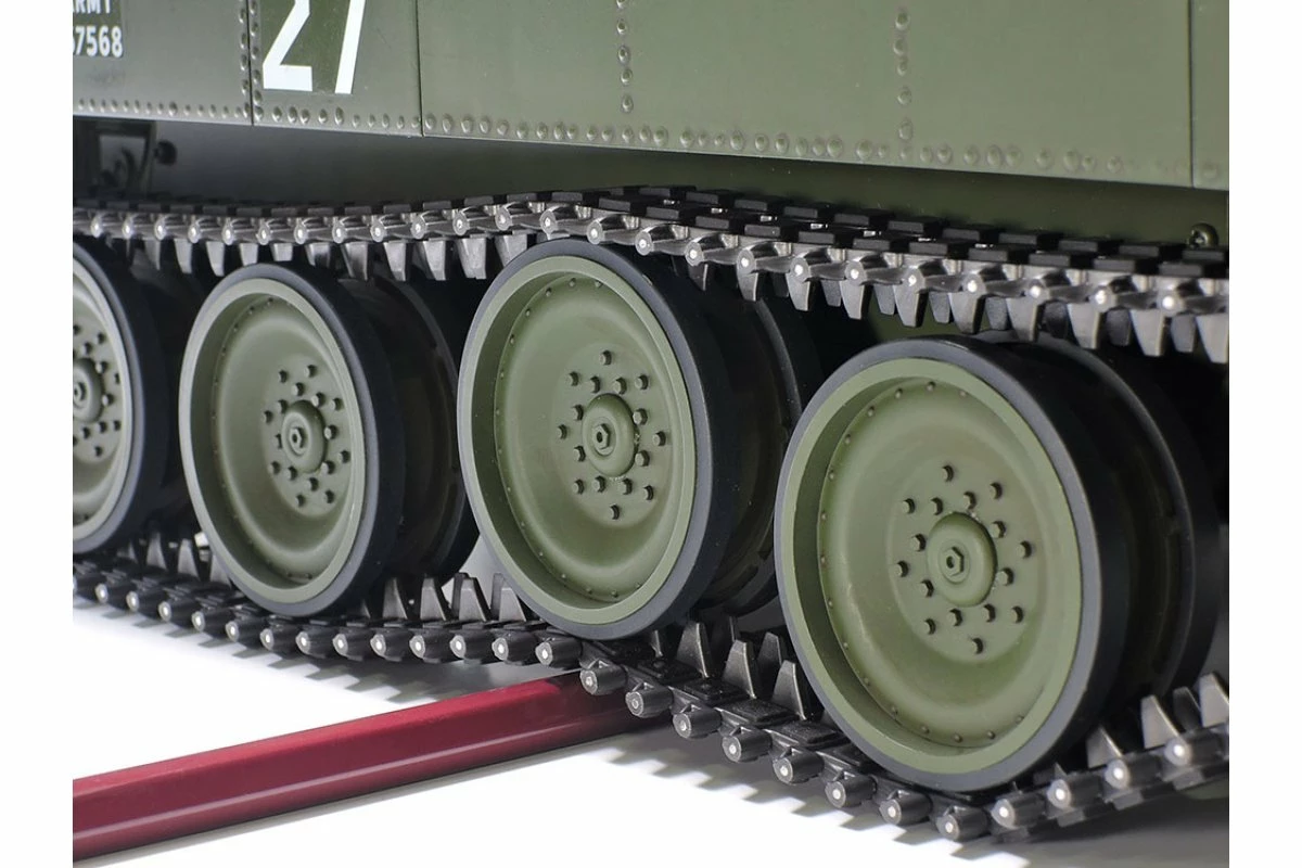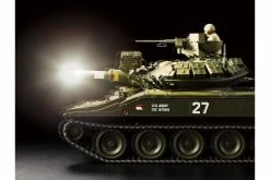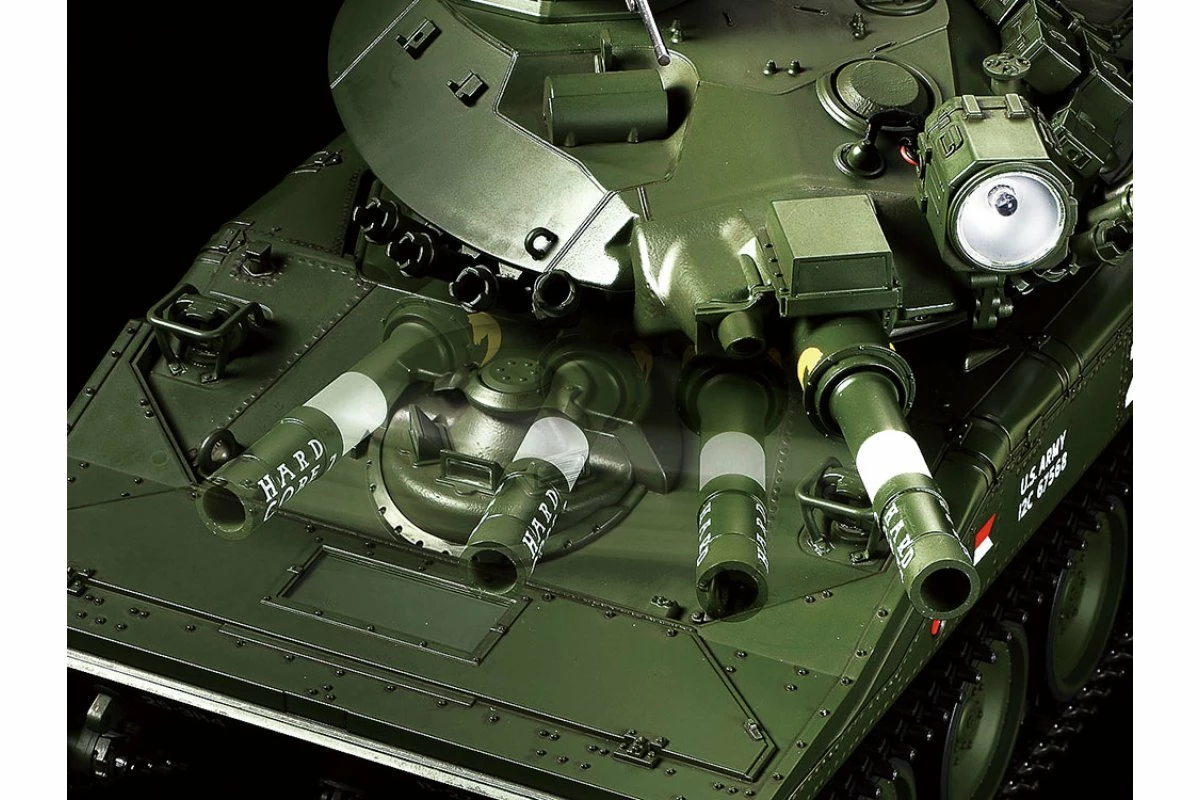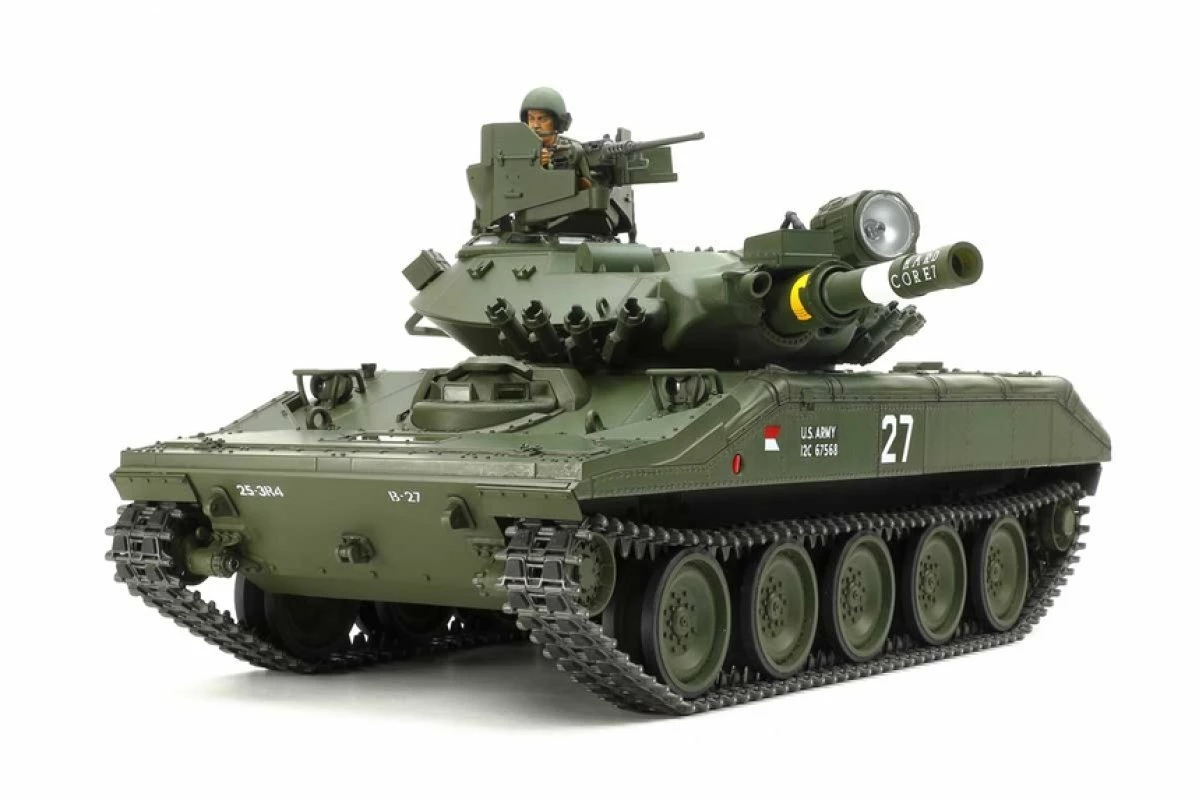 This massive Tamiya R/C replica recreates the shape of the rather unique M551 Sheridan in 1/16 scale. The M551 was designed as airdrop capable armor with wading capabilities, a key concept as the U.S. took on the role of global policeman post-WWII. With an aluminum hull and rolled steel turret, it weighed just 15 tons, but had impressive firepower in the shape of the M81 152mm gun/launcher, which could fire standard rounds and MGM-51 Shillelagh missiles. The M551 was in service with active units from 1968 to 1996 and saw action in the jungles of Vietnam.
