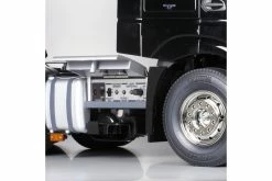 The Tamiya rendition faithfully captures the truck’s modern form with the use of ABS plastic body parts and a number of metal chassis components. One look at the detailed interior and auxiliary equipment, such as air tanks, will confirm that the body features replica-quality realism, which is further enhanced with metal transfers depicting emblems and numerous metal-plated parts. The chassis is built for durability as it uses aluminum side channels with resin cross members. Drivability is accomplished by power from the front-mounted motor and is transmitted via a propeller shaft to the rear axle; built-in differential gears guarantee smooth cornering. Gear changes can be made via a separately-sold 4-channel transmitter.Â