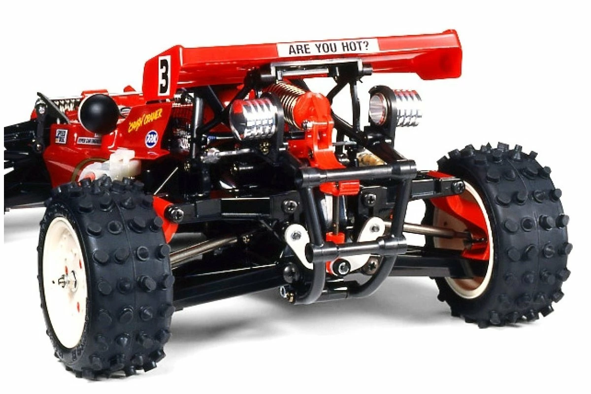 Tamiya designers have given the Hotshot a makeover, replacing older, harder to assemble parts with modern equivalents but still keeping true to the spirit of the original Hotshot. While the front/rear double wishbone suspensions and adjustable mono-shock oil dampers remain the same, the drivetrain features modern dog bone type propeller shafts for enhanced reliability. The oil dampers have also been changed to the more modern diaphragm type. Also, with the use of a modern ESC, the original Hotshot’s rear aluminum heat sink was no longer necessary. However, the Hotshot would not look the same without it, so our solution was to install a dummy part to remain faithful to the original look. Take this updated Hotshot out for a spin and compare it to today’s R/C buggies to experience how far this hobby has developed!