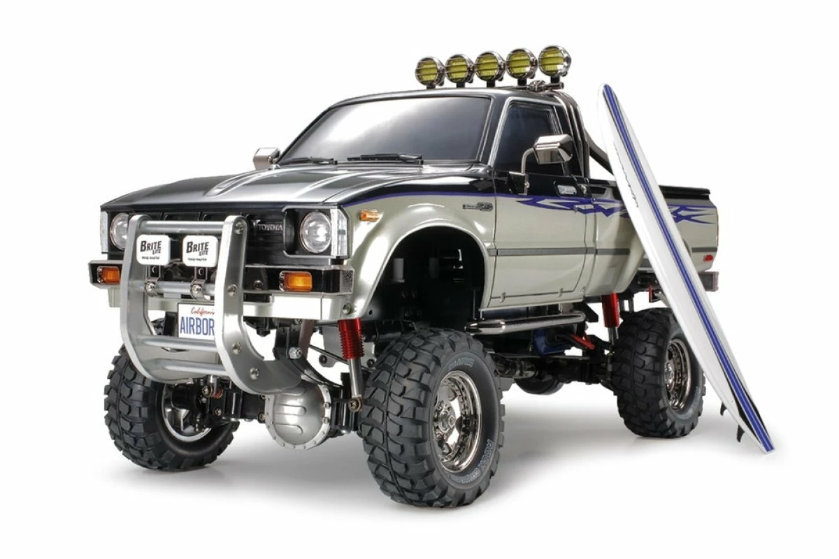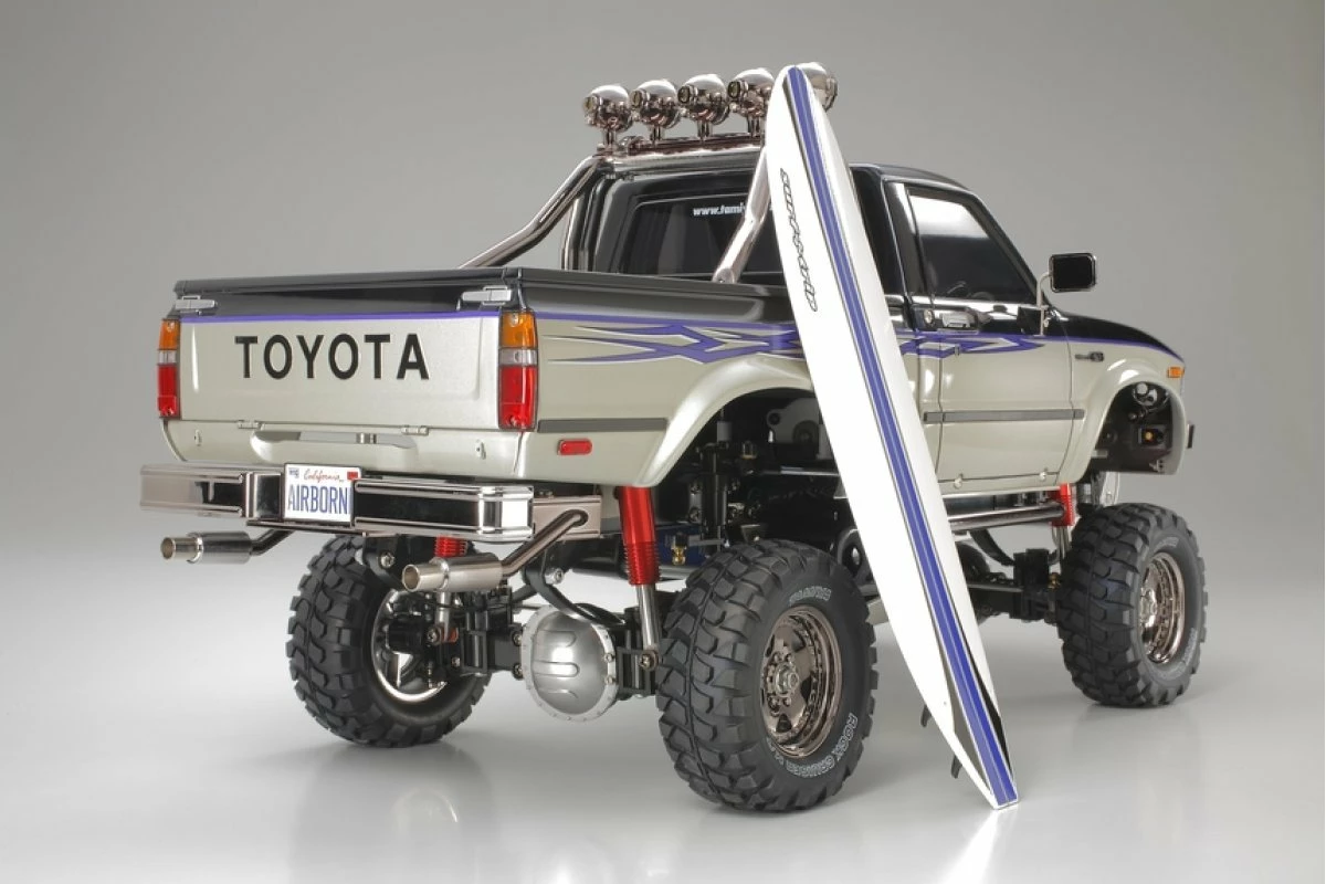 One of the most popular pick-up trucks of all time, the Toyota Hilux, follows the Ford F-350 as the 2nd new R/C pick-up truck release. Tamiya spared no expense in developing this truck to be the most realistic ever, with a ladder frame chassis and 4WD system just like the actual truck. The 3-speed transmission provides lots of enjoyable driving options and a plethora of metal parts such as the front guard, leaf springs, and aluminum friction dampers make for a very interesting assembly kit. The large diameter tires provide impressive ground clearance and enhances the realistic resin body’s muscular look. Metal-plated parts for the roll bar, front grill, front/rear bumpers, and muffler provide extra detail highlights throughout the model as well. To top off this unique model, parts for a surfboard are also included.