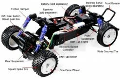 Chassis features a semi monocoque structure which the body is secured to ABS resin bathtub chassis and acts as the chassis’ strengthening part. Independent swing axles for the front suspension, a rolling rigid rear suspension, and large-sized friction dampers effectively absorb shocks and bumps. Fully enclosed gearbox prevents dirt and debris from coming in, and differential gears allow smooth cornering. Wide groove front tires and rear square spike tires are installed on one-piece wheels to improve off-road driving performance. A wide range of option parts such as oil dampers are available to further customize your machine.