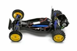 The bathtub type frame chassis features a longitudinal battery layout for a lower centre of gravity and optimum weight distribution. 4-wheel double wishbone suspension is equipped with coil spring shocks to provide superb off-road traction. A sealed gearbox protects against sand and debris and is equipped with differential gears to efficiently transmit the power from the type 380 motor. By installing a separately available Type 540 motor and corresponding pinion gear, more powerful driving can be enjoyed.
