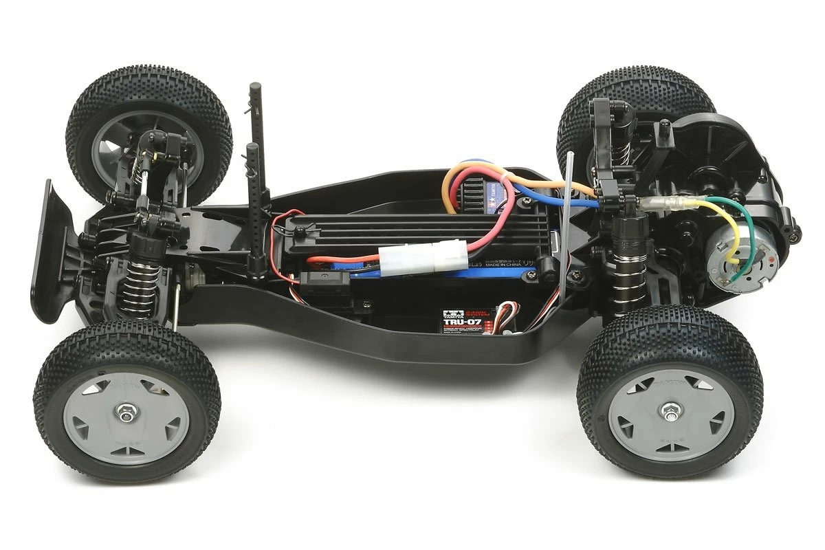 The DT-02 chassis bathtub type frame chassis features a longitudinal battery layout for lower center of gravity and optimum weight distribution. 4-wheel double wishbone suspension is equipped with CVA oil damper units to provide superb off-road traction. A sealed gearbox protects against dust and debris and is equipped with differential gears to ensure smooth cornering. Star-dish wheels are paired with dual block K tires front and rear to ensure that the model offers a dynamic drive.