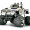 The assembly kit of the Midnight Pumpkin (first released in 1987) features a highly detailed pick-up truck body that is reminiscent of the classic 1950s American designs. The special “Black Edition” body comes moulded in black and is accentuated by the metal plated front grille, overhanging fenders, dampers, and roll bar. All this detail sits on top of big 115mm diameter tyres.