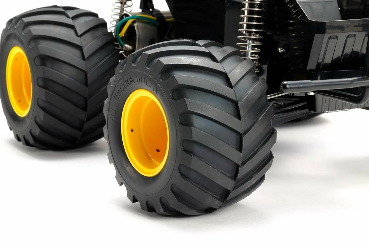 The CW-01 is a simple & easy-to-assemble 2WD chassis with big tyres! The bathtub-type frame and suspension support the hollow tyres with a diameter of 115mm and has an independent front swing axle & rear rolling rigid coil spring, enabling dynamic driving even on rough roads. The reliable gearbox is sealed with a built-in differential gear. Hard acceleration on a grippy surface will let you lift the front wheels with the included rear wheelie bar, so you can feel like you’re driving a real monster truck!