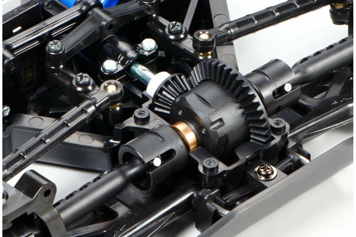 The shaft-driven 4WD TT-02B buggy chassis uses a skid-shaped frame. Its suspension setup uses 4-wheel independent double wishbone suspension with long arms, plus CVA shock units, giving the car assured handling, while left and right suspension arms and uprights are identical to facilitate hassle-free assembly. Front and rear gearboxes include 4-bevel differentials for smooth operation, and are sealed to ensure that dust can’t get inside. The top can be removed simply by loosening four screws, making maintenance a breeze. Four different gear ratios can be applied with the use of three separately-sold types of pinion gears, allowing you to match the characteristics of your car setup to the conditions at any given time. Of course, this off-road chassis also includes receiver case and motor cover to protect them from dirt and debris thrown up off of the track.