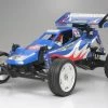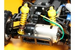 This is an update of a popular 2WD buggy model which was a stablemate of the famous Hotshot in the late 1980s. The elegant, slim polycarbonate body brings to mind the image of a full-size racing buggy, and its markings take inspiration from the original model. Jazzy gold color metal-plated wheels are fitted with front ribbed and rear oval block tires for excellent off-road performance. The model includes a driver figure to install in the cockpit.