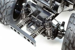 This gear-driven 4WD chassis is based around a lightweight and tough monocoque frame, with power provided by the centrally-positioned motor. It utilizes a ‘square’ setup with near-identical tread and wheelbase lengths. Sealed gearbox is integrated into the frame and protects from dust and debris, while the built-in front and rear differential gears provide smooth cornering. This is reinforced by 4-wheel double wishbone suspension and friction dampers plus a 2-piece tie rod steering setup with the servo on the left for excellent response. Furthermore, it has 5-spoke metal-plated wheels fitted with big 110mm diameter tires, in addition to a rear support bar with roller to prevent the model from flipping.