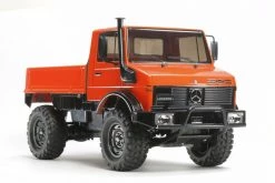 This is an R/C model assembly kit of the multi-purpose 425, a vehicle in the famed and long-running Mercedes-Benz Unimog series. The polycarbonate body captures with great accuracy the squared lines of the 425, including the boxy cabin and square headlights. This kit also includes separate parts to depict side mirrors and snorkel, plus metal-plated parts capturing the light cases and emblems with aplomb. The all-terrain CC-01 chassis is a perfect choice to accompany this rugged all-rounder, and is matched with block tires for great performance on- and off-road.