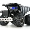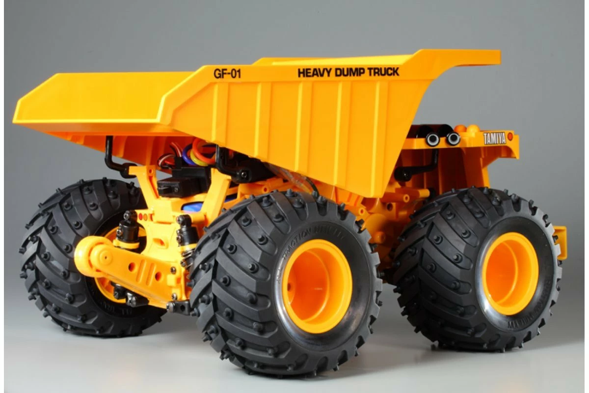 Dump trucks earn their living in some of the toughest workplaces around: large-scale construction sites, mines and quarries to name but a few. The largest of them are known as “off-highway trucks” which cannot be driven on public roads; factory built, they are disassembled and component parts such as the chassis, cab, fenders, axles and rear bed are transported via trailer to their employer, where they are re-assembled on site. These giant vehicles can reach the height of 2-storey buildings, with tires exceeding 4 meters in diameter, engines generating over 3,500hp, and an ability to carry loads topping 300 tons. Some can even be controlled remotely for use in dangerous environments. Now, you can feel the power scaled down into realistic 1/24, with the addition of this exciting new R/C model assembly kit, with realistic yellow ABS resin molded cab and rear bed parts. The model runs on the gear-driven 4WD of the GF-01 chassis.