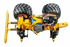 This gear-driven 4WD chassis is based around a lightweight and tough monocoque frame, with power provided by the centrally-positioned motor. It utilizes a ‘square’ setup with similar tread and wheelbase lengths. Sealed gearbox is integrated into the frame and protects from dust and debris, while the built-in front and rear differential gears provide smooth cornering. This is reinforced by 4-wheel double wishbone suspension and friction dampers plus a 2-piece tie rod steering setup with the servo on the left for excellent response. Furthermore, it has wheels molded in yellow to match the chassis, fitted with big 115mm diameter tires, in addition to a rear support bar with roller to prevent the model from flipping.