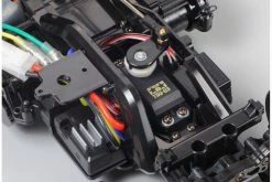 The front wheel drive M-05 chassis features a lightweight, narrow, durable, and easy-assembly semi-monocoque resin frame. Gearbox, motor, battery pack, receiver, servo and ESC are positioned for optimum weight distribution and a low center of gravity. Ground-hugging 4-wheel independent double wishbone suspension and the 3-piece steering linkage provide stable high-speed cornering. Gun metal color 11-spoke wheels are matched with tread-patterned radial tires and feature tire inserts.