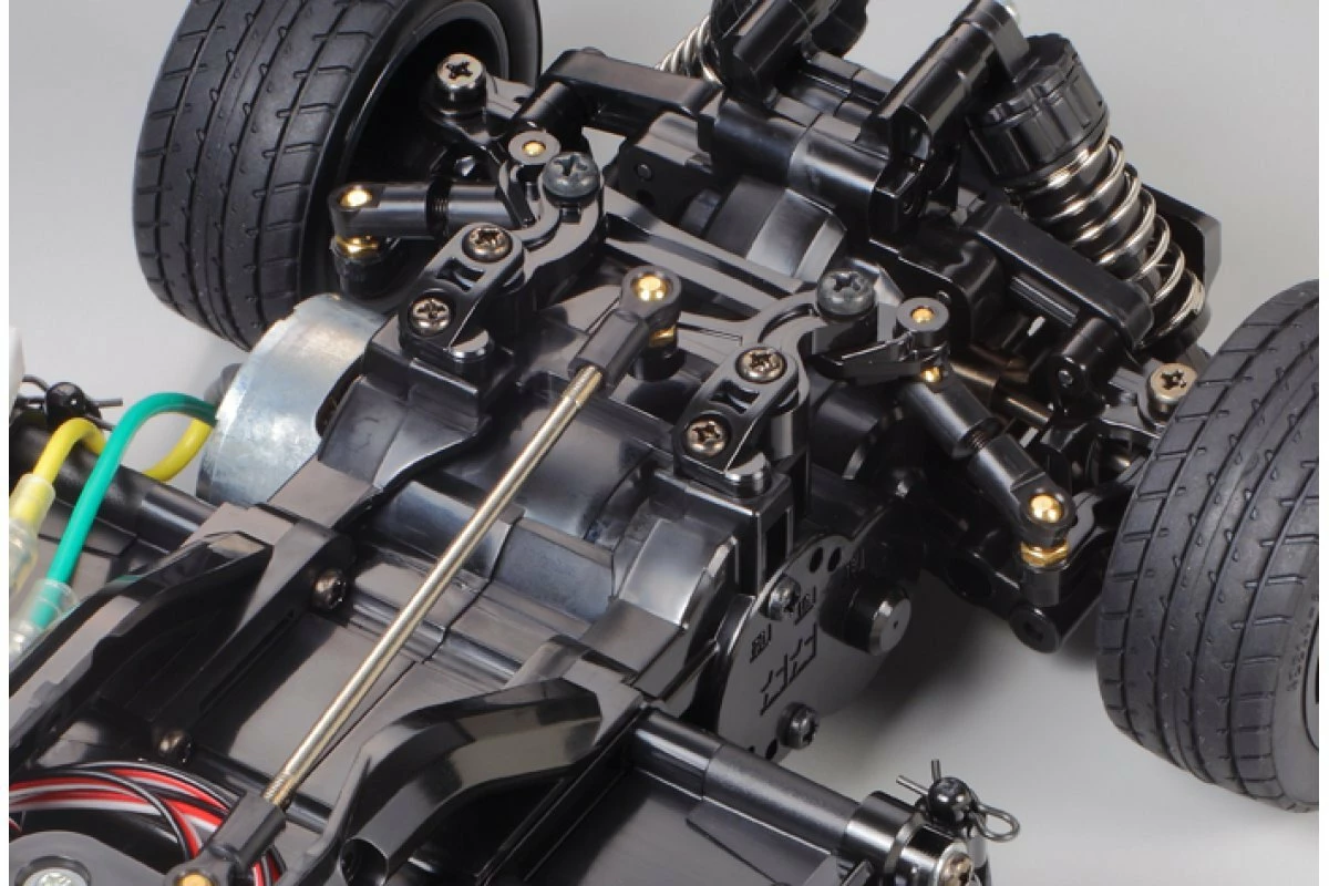 The Tamiya R/C model faithfully captures the fun and maneuverability of the real life subject as it comes on the proven M-05 M-chassis platform. The M-05 is a simple to build FWD (front wheel drive) machine, which allows for plenty of after-market parts to be outfitted as you grow with your skill. The lightweight, narrow semi-monocoque frame offers an optimized weight distribution and a low center of gravity. A ground-hugging 4-wheel independent double wishbone suspension and a 3-piece steering linkage ensure excellent stability during high-speed cornering.Â