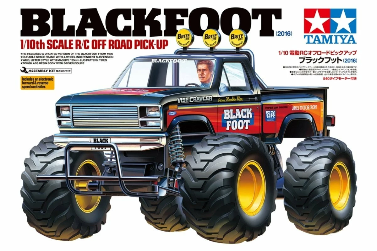 This re-release version of the Blackfoot assembly kit features a chassis with a number of updates while keeping largely to that used on the original off-road car released in 1986. It includes a highly realistic ABS body with roll bar and metal plated front grille parts. The kit also comes with colorful marking stickers and a driver figure.