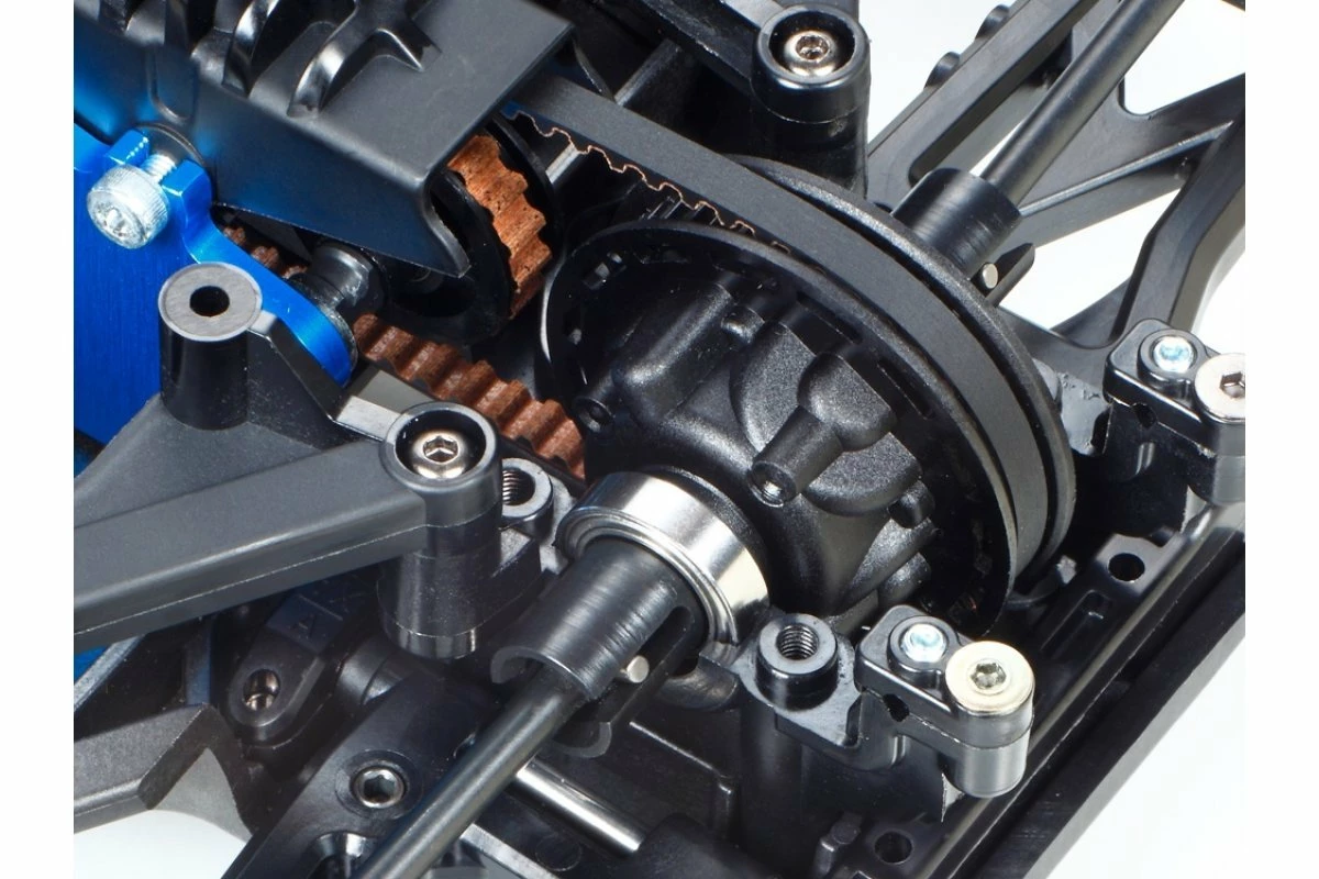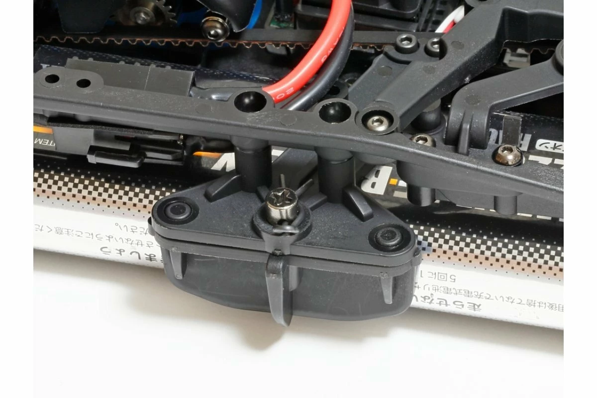 TRF419 suspension parts and gear differentials give top-level performance and reliability. Like on the TRF419, the servo mount is attached on one side only, with chassis flex in mind. The battery can be removed via the chassis side.