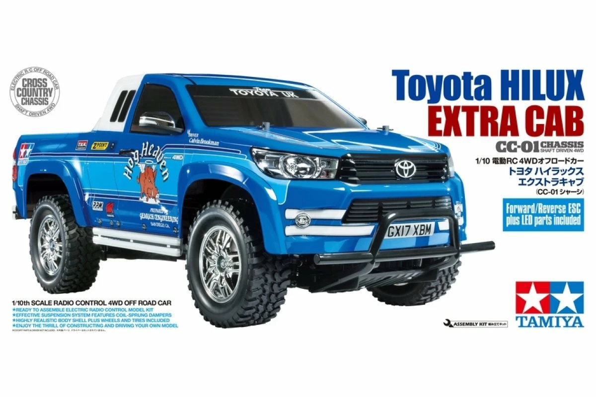 This model recreates the classic Toyota Hilux in the form of a new polycarbonate body mounted on the reliable and fun CC-01 cross country chassis. The kit depicts the 8th generation of the Hilux vehicle, released back in 2015, specifically a special full-size version of the Extra Cab which Toyota’s British division had made in the colors of Tamiya’s legendary Bruiser as a tribute to our model. It also appeared in some high-profile PR activities in Great Britain.