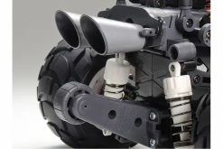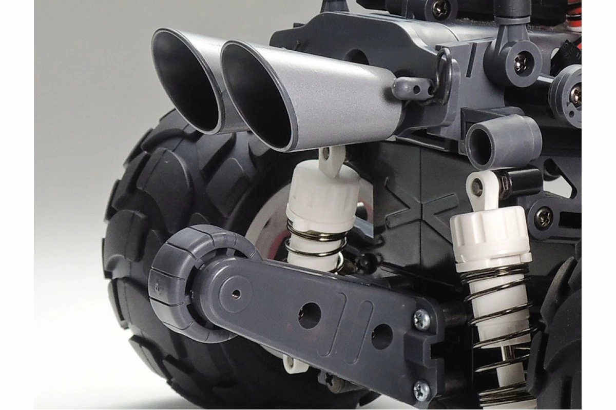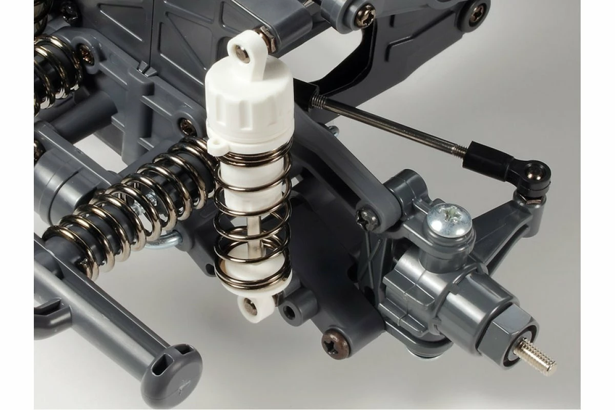 The WR-02CB chassis is an exciting chassis at home on- and off-road, providing smooth driving and the potential for exciting wheelies! It features a pre-assembled gearbox with motor already attached to save time in the assembly process. Long suspension arms and CVA oil dampers make for excellent off-road performance, while under guard and side guards give great protection. A rear wheelie bar helps support the model when it leans back, maintaining a fun wheels-in-the air stance as the model plunges forward. Green and white 2-piece wheels are joined by bubble tires (front: ribbed, rear: round block) for a fun look and drive.