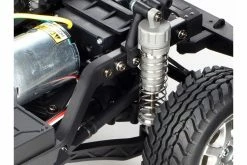 Designed for a wide range of off-road scenes including rocky terrain, the CC-02 chassis’ ladder frame is inspired by full-size vehicles and is the base for its superior durability. A 4WD setup employs the motor longitudinally behind the front axle with separated gearbox and transfer case, and propeller shafts transmitting power to the differential gears front and rear. Four-link rigid suspension is employed front and rear, with CVA oil dampers for all-encompassing control, even on tricky rock sections. This model comes with matte plated seven-spoke wheels and grippy block pattern tires.