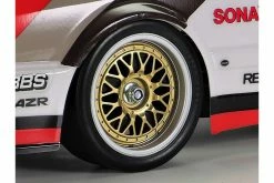 The shaft-driven 4WD TT-02 chassis employs a longitudinal layout with the battery on the left and the motor on the right to give excellent stability. Also, it features identical left and right suspension arms and uprights for ease of assembly, plus easy-to-maintain gearboxes. It is a highly adaptable chassis, as it offers 2 different wheelbases, 2 ground clearance settings and 2 tread set-ups in addition to a range of 10 possible gear ratios. It is not short on looks either, with brake disc-shaped wheel hubs and stylish front bumper supports. Wheels use slick tyres with gold spokes and silver rims.