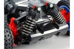 Based around a tough monocoque frame with integrated gearboxes, this compact 4WD chassis gives a thrilling drive whether you take it on road or flat dirt surfaces. It features a rear-mounted motor, with gear-driven rear wheels and a propeller shaft taking power to the front. Both front and rear gearboxes have differential gears. The battery pack location in the chassis center secures excellent balance, while 4-wheel independent double wishbone suspension employs friction dampers. Rally Block tires with width/diameter of 27/69mm are also included.