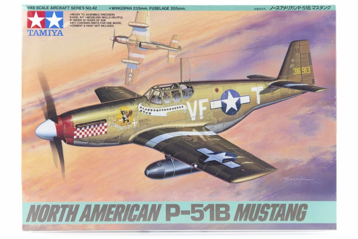 This kit depicts the B-variant of the legendary P-51 Mustang, which differed from the later P-51D in several important ways, including the “Razorback”-style fuselage. Parts are included for two 500lb bombs, two drop tanks, and one pilot figure. Three marking options are also included.