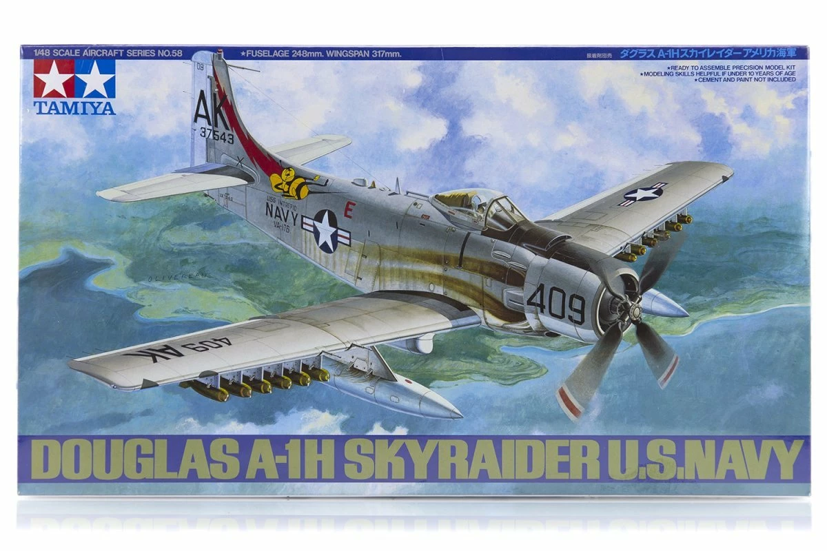 First introduced in 1946, the A-1 Skyraider’s frontline career as the U.S. Navy’s last piston-engined attack aircraft continued for thirty years until it’s final service providing close-air support and rescue helicopter escort during the Vietnam War. This kit depicts the most produced variant, the A-1H, and accurately reproduces the aircraft’s robust form. Engine cowl flaps, wing flaps, and dive brakes may be posed in open or closed positions. Parts are included for ordnance such as 250lb bombs and 5-inch rockets to depict a fully-armed machine. One pilot figure and three marking options are also included.