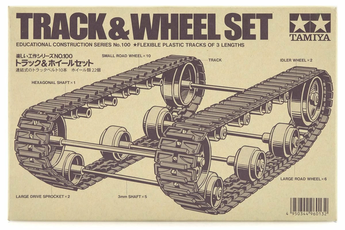 Allowing for a large degree of adjustability and creativity in design, the Track and Wheel Set offers three different lengths of tracks to choose from. Sprocket wheels, idler wheels, and road wheels have all been included. Use with a variety of Tamiya Construction and Robotics products.